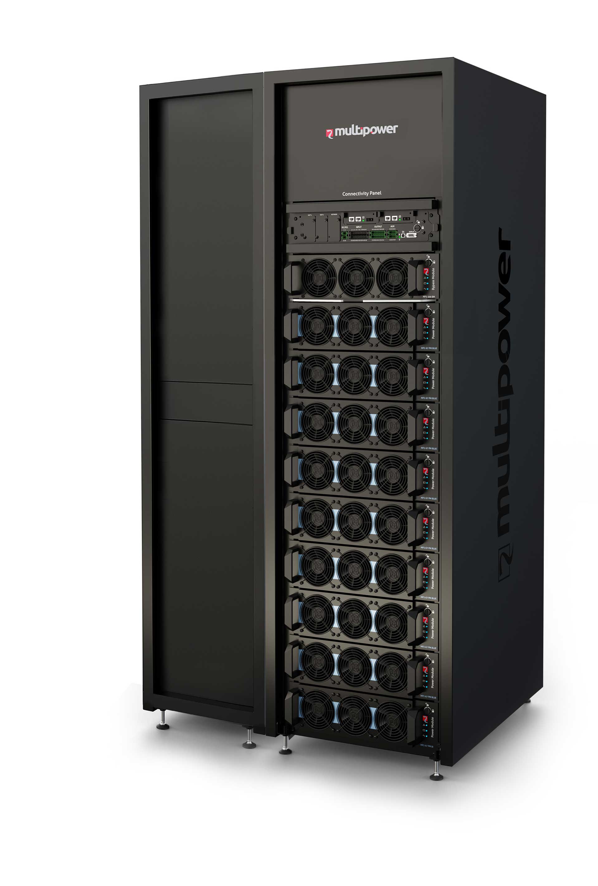 Mit neuen Power Modules mit hoher Dichte, die in drei verschiedenen Größen und zwei verschiedenen Technologien erhältlich sind, erreicht Multi Power2 bis zu 600 kW in einem einzigen USV-Schrank und bis zu 3600 kW mit sechs parallel geschalteten Systemen.